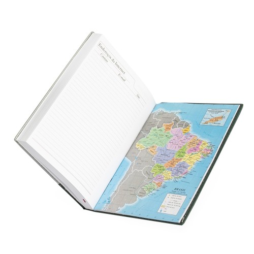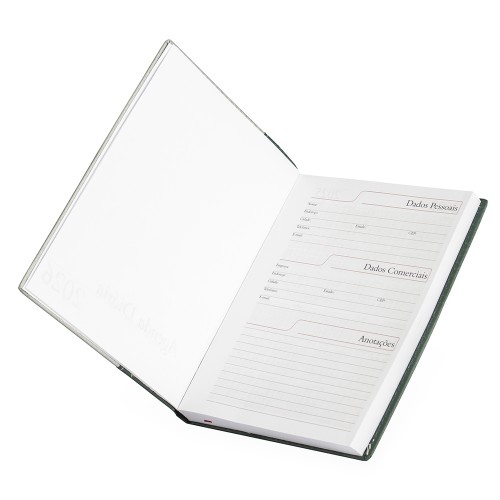 Personalizada Descrição: Agenda diária 2025 de couro sintético. Contém fita de cetim marca página, dados pessoais, calendário de 2025 à 2027, mapa do Brasil, mapa-múndi, índice telefônico e planejamento. OBS.: PEDIDOS APENAS MÚLTIPLOS DE 10 PEÇAS! Altura : 20 cm Largura : 14,9 cm Medidas aproximadas para gravação (CxL): 9 cm x 8 cm Peso aproximado (g): 377