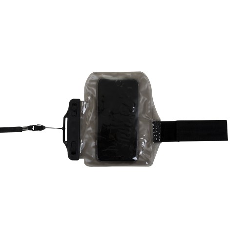 Capa braçadeira impermeável para celular. Parte frontal transparente e verso fosco, suporte plástico superior com fivelas rotatórias(basta rotacioná-las para abrir o case). Possui na lateral fita elástica com velcro para e acompanha cordão de cetim.