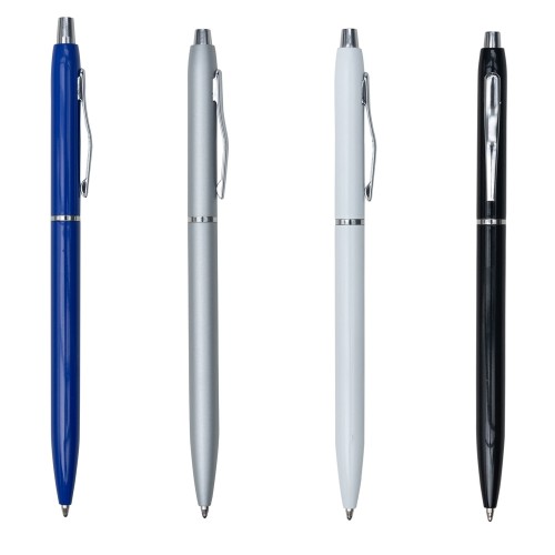 Caneta metálica com carga esferográfica azul e acionamento por clique.