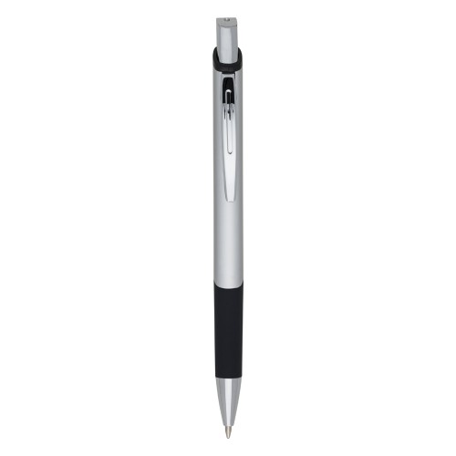 Caneta metálica com design quadrangular, acabamento brilhante (exceto a prata) e detalhe emborrachado, carga esferográfica azul e acionamento por clique.
