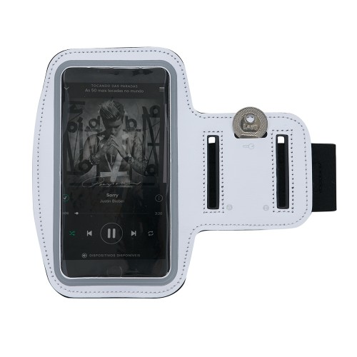Descrição: Braçadeira de neoprene com detalhe frontal em couro sintético. Visor plástico e contorno prata, possui "bolso" para chave, "cinta" de velcro regulável com posição indicativa na lateral(A e B). Possui contorno azulado no velcro, parte traseira possui 4 áreas vazadas para poder passar o fone de ouvido(também possuem contorno azulado).