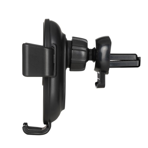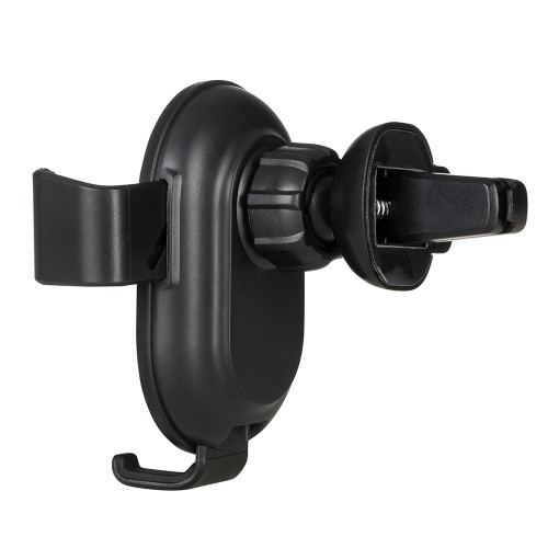 Suporte veicular com carregamento por indução. O produto contém hastes de ajuste automático. Acompanha presilha para encaixe na saída de ar do veículo e cabo USB para ativação do modo indução.