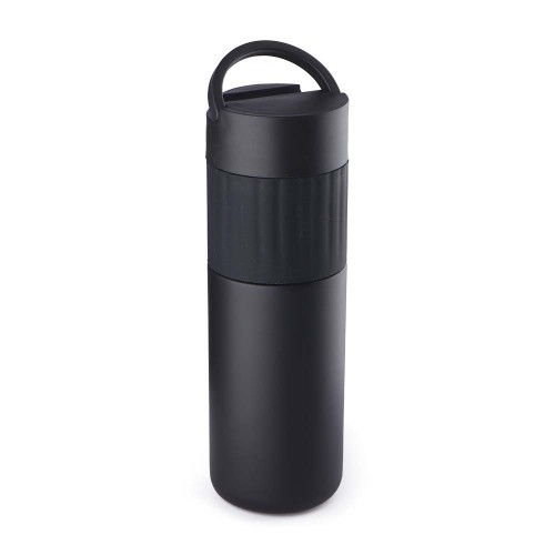com capacidade de até 500ml. Conserva a temperatura quente ou fria, com alça e suporte para celular na tampa. Apoio para mão emborrachado e tampa rosqueável com anel de silicone para vedação.