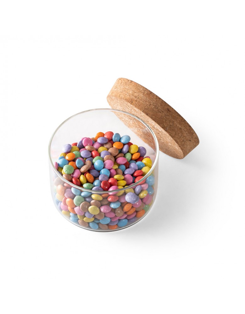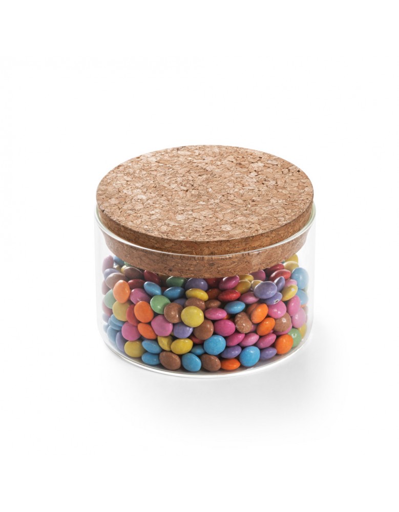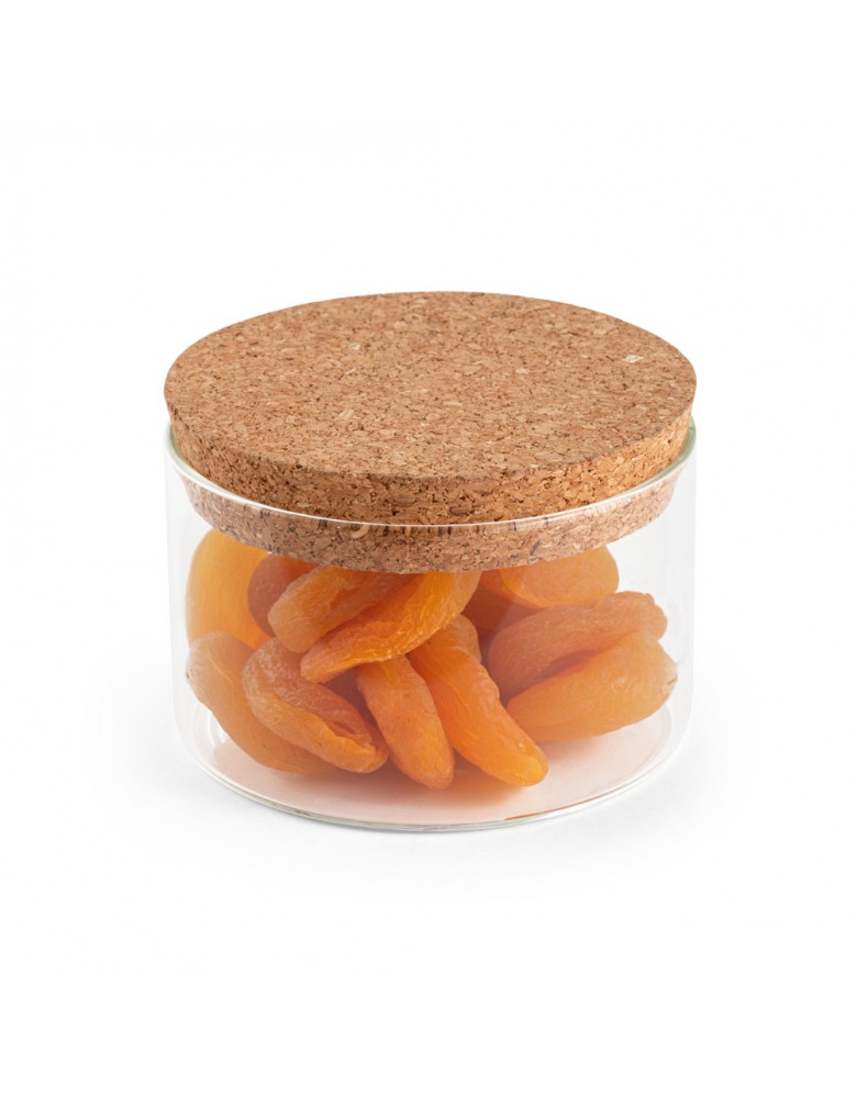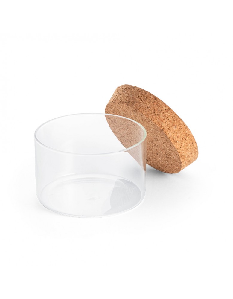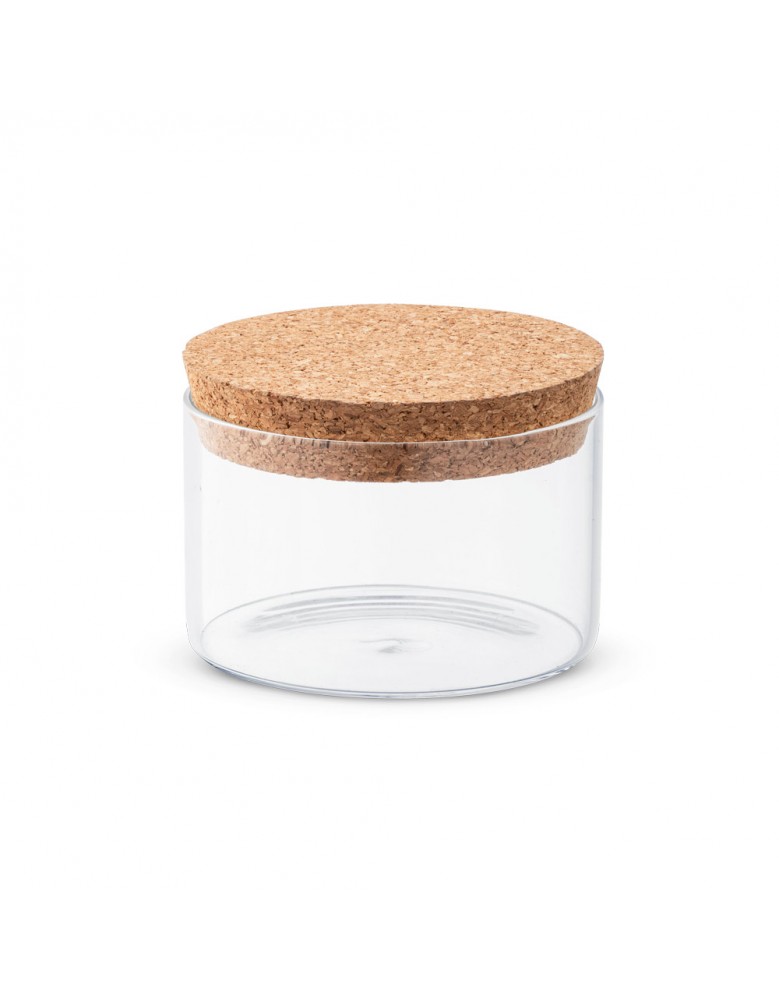 Frasco em vidro borosilicato e tampa de cortiça. Capacidade até 380ml. Food grade. Fornecido em caixa presente de papel craft. ø95 x 60 mm