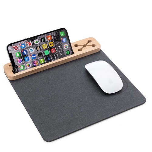 Mouse Pad com Porta Canetas;, Porta Cartões e Apoio para Celular personalizado Mouse Pad em material sintético grafite e bambu, contendo: Porta Canetas; Porta Cartões;